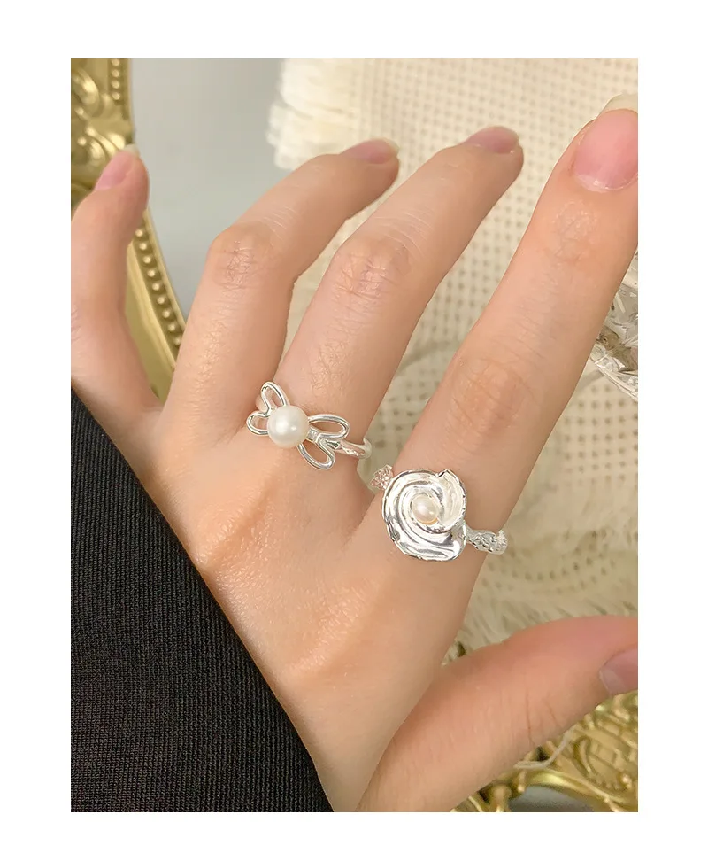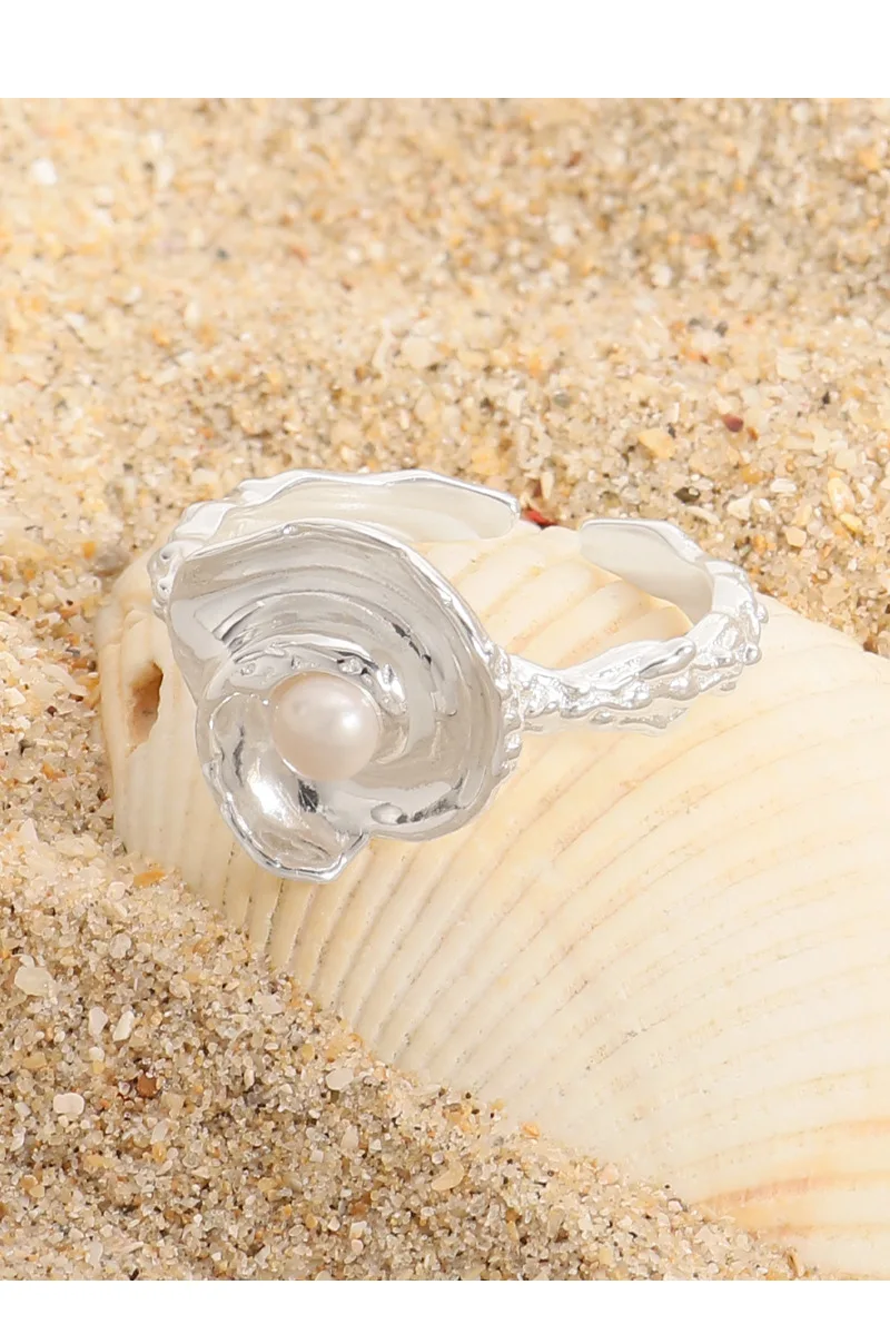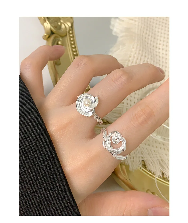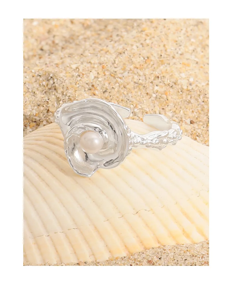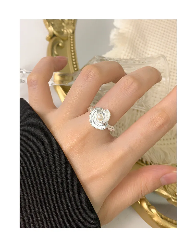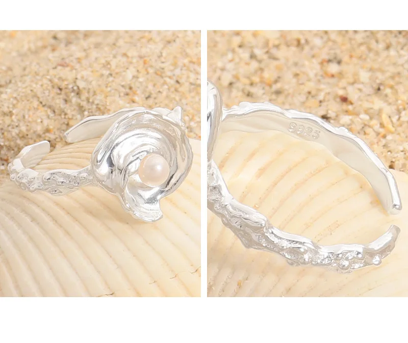 100% Authentic 925 sterling silver Natural pearl irregular wrinkled texture ring with conch shaped design open ring
